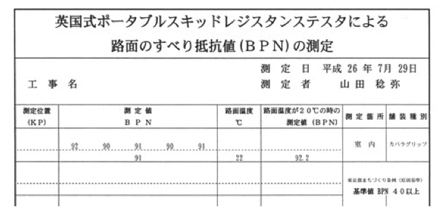 ※東京都まちづくり条例など地方公共団体では、インターロッキングブロック舗装設計施工要領に「湿潤状態で40BPN以上」という、すべり抵抗値(BPN)を基準値として定めています。